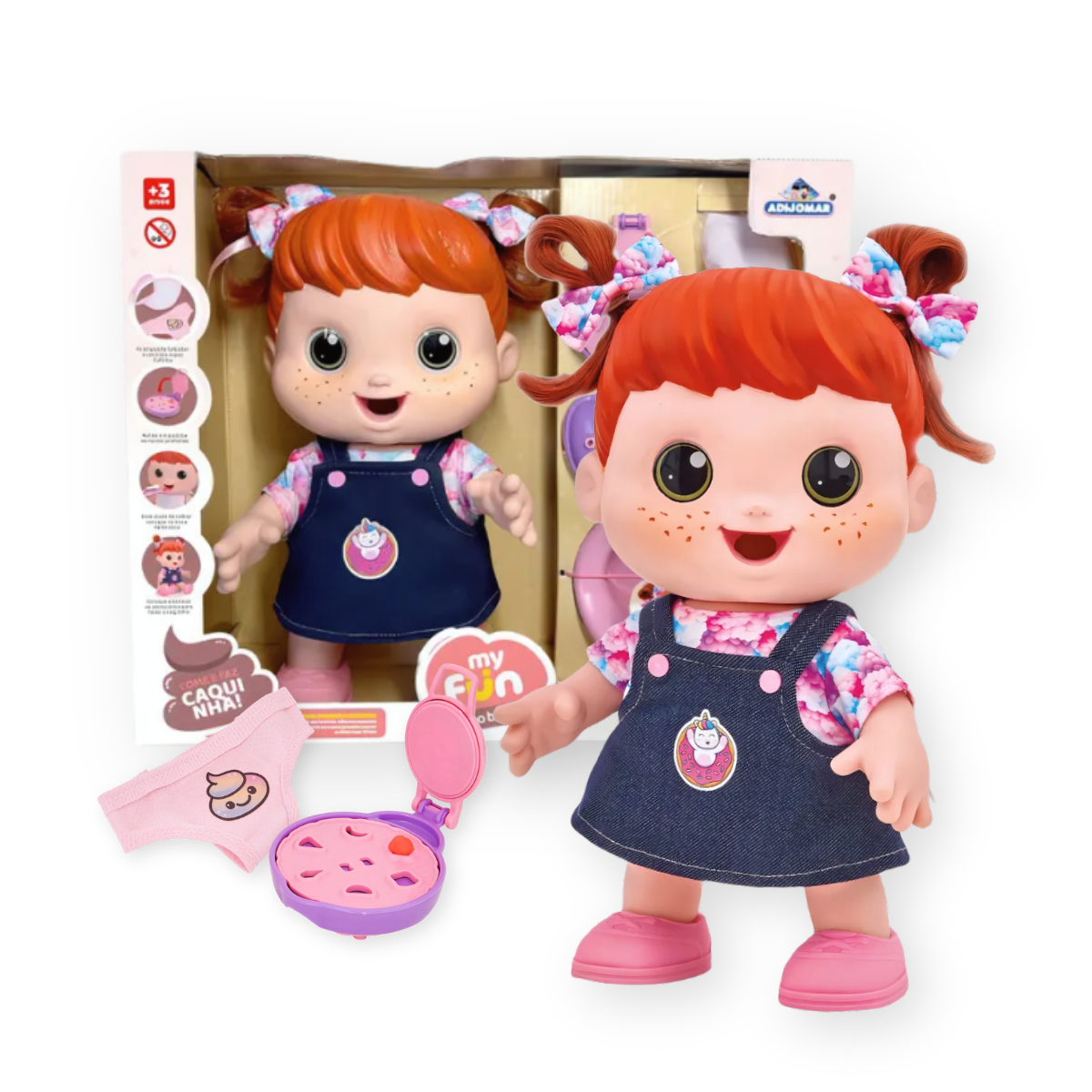 - Itens inclusos: 01 boneca grande, 01 massinha de modelar, 01 modelador com forminhas, 01 colher com mecanismo de empurrar, 01 potinho porta papá, 01 peniquinho, 01 babador e 01 calcinha