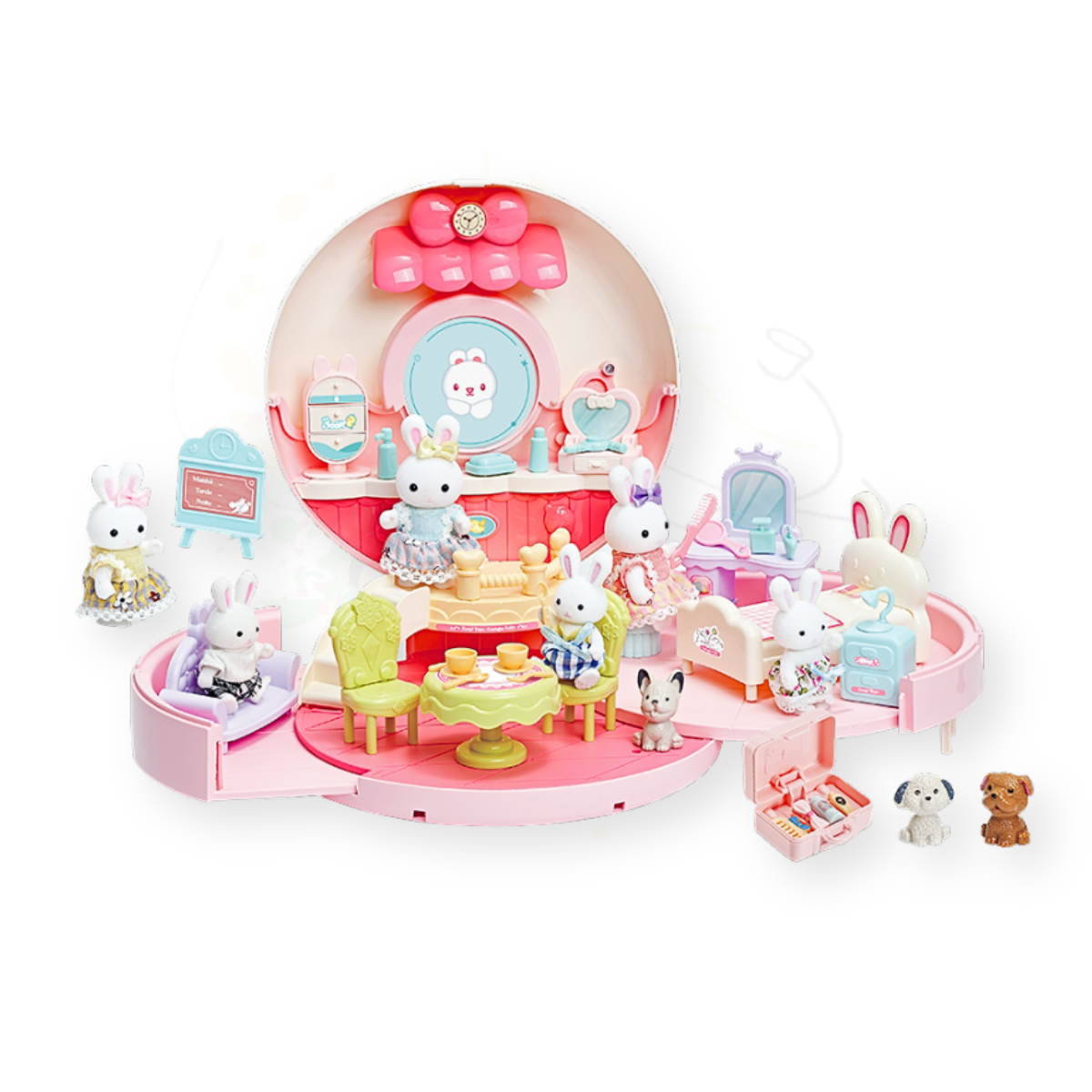 - Itens inclusos: 1 Bolsinha Donut (casinha), 2 bonecos coelhinhos com roupas, conjunto de móveis e acessórios em miniatura